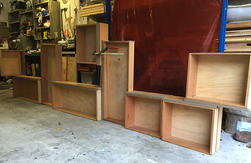 We also had to do some creative thinking to design the shelving system. The drawers were perfect to store, organise, and display items. They fit so well with the affordances of the work area behind the bench. The UpShop Industries workshop also provided reclaimed industrial lighting.
